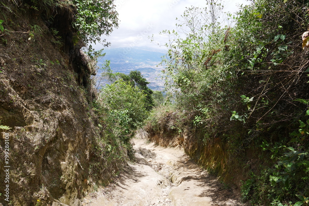 Ausgewaschener Wanderweg bzw Hohlweg am Cruz de Alajuelita in den Bergen von Escazú Berglandschaft bei San José in Costa Rica