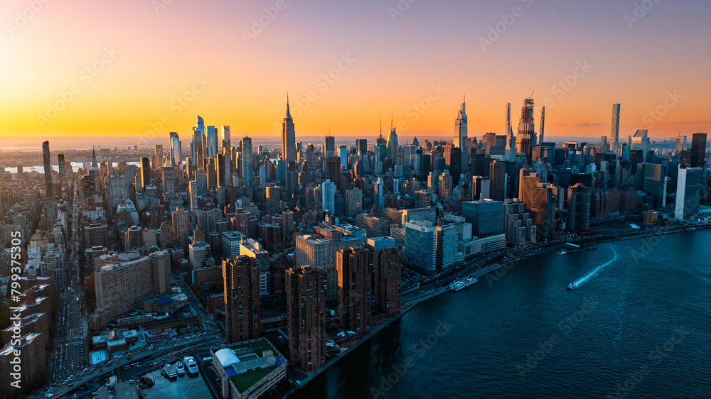 Orange light of setting sun illuminating the skyscrapers and high-rise buildings in New York scenery. Top view on the metropolis from above the East River.