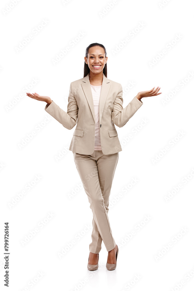 Choice, studio and African woman for business or career, cheerful or happy with smile. Female person, secretary and hands on white background, professional with comparison and versus in Jamaica