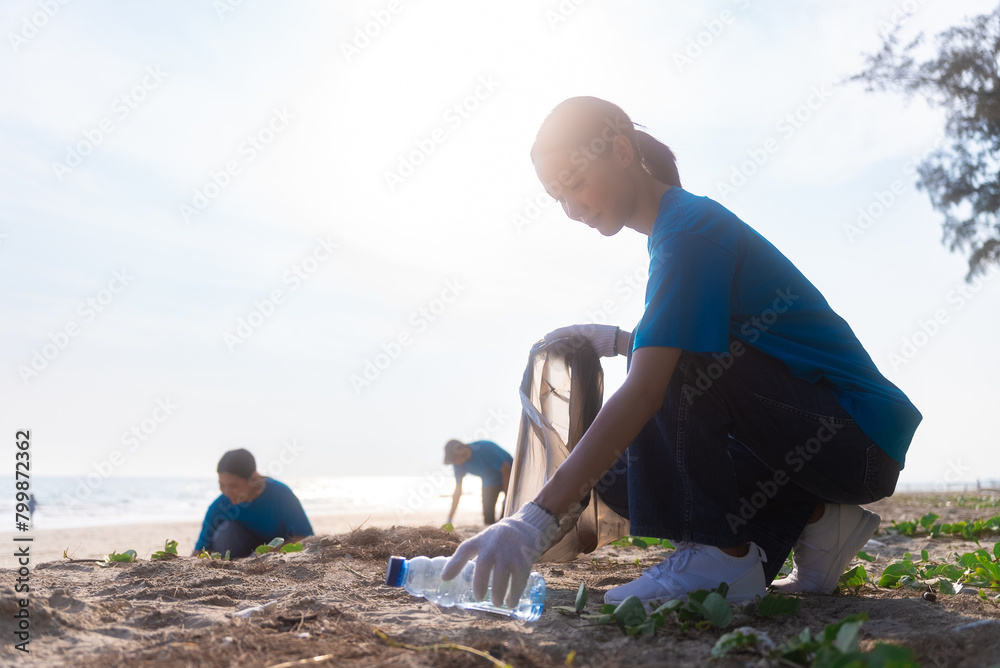Plastic pollution and environmental problem concept. Happy asian diverse group of volunteers with garbage bags wearing blue t-shirt and cleaning plastic on the beach. Volunteers collecting trash.