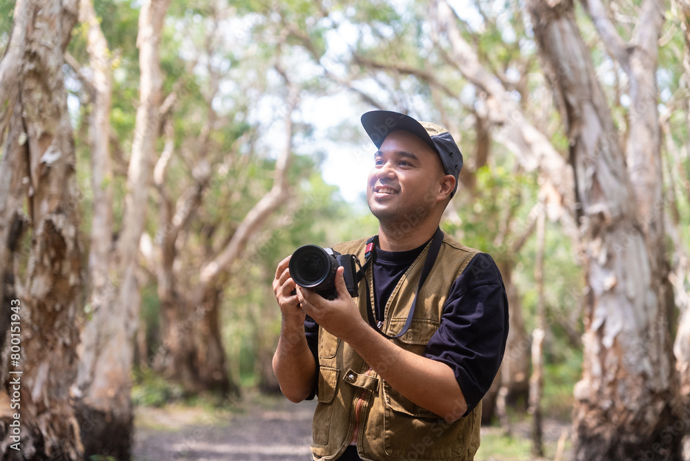 Happy asian man explores mangrove forests with camera. He admires lush foliage, serene ambiance in tropical botanical garden. Traveler enjoys eco-tourism, nature walks.