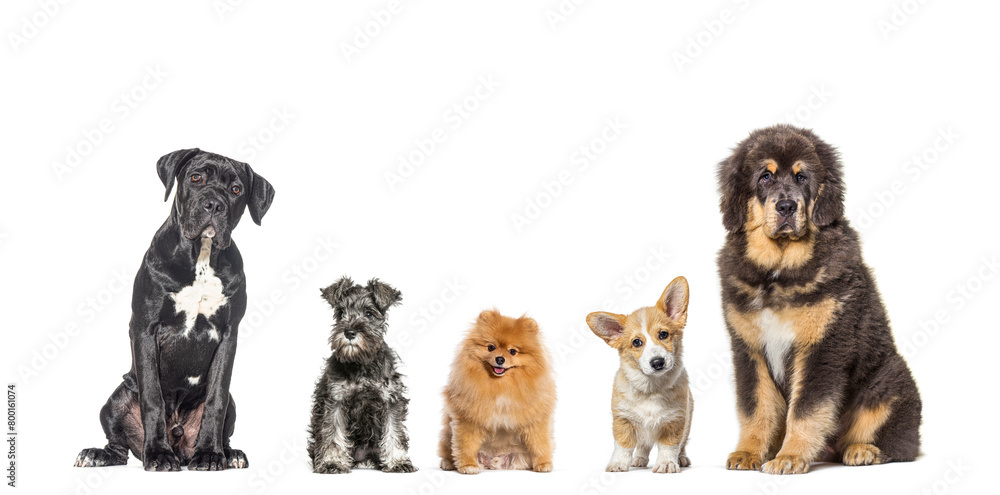 Five dogs of different breeds sitting together in a row, looking at the camera, isolated on white