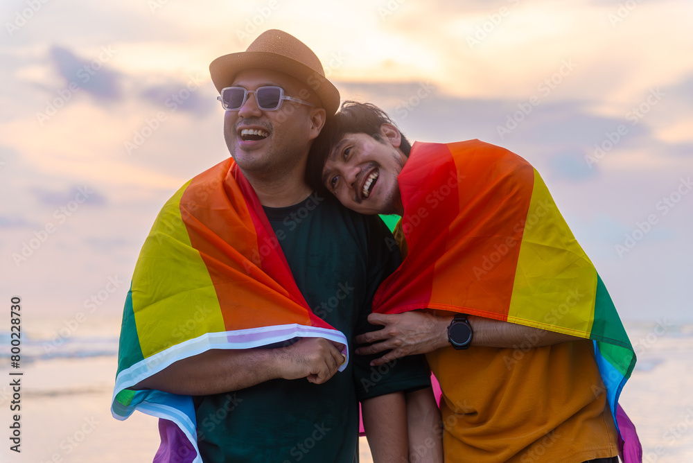 Happy Gay couple with lgbt flag looking to sunset together on the beach in summer day. Happy guys demonstrate their rights. LGBTQI, Pride Event, LGBT Pride Month, Gay Pride Symbol.