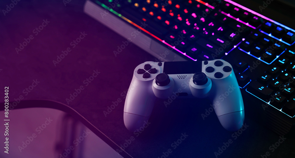 Playing video games. Computer keyboard with RGB lighting and wireless controller on table indoors