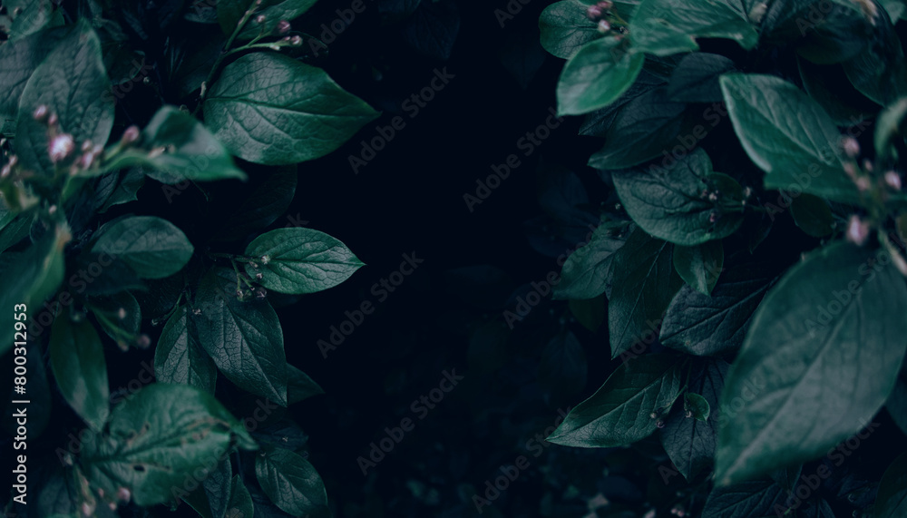 Green leaves of evergreen bush close up as dark floral botanical natural background pattern wallpaper backdrop, Cotoneaster lucidus, cold coloring shrub, vertical