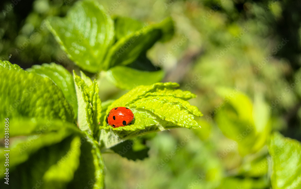little red ladybug sitting on green leaf close up in sun light during sunny day, view on back