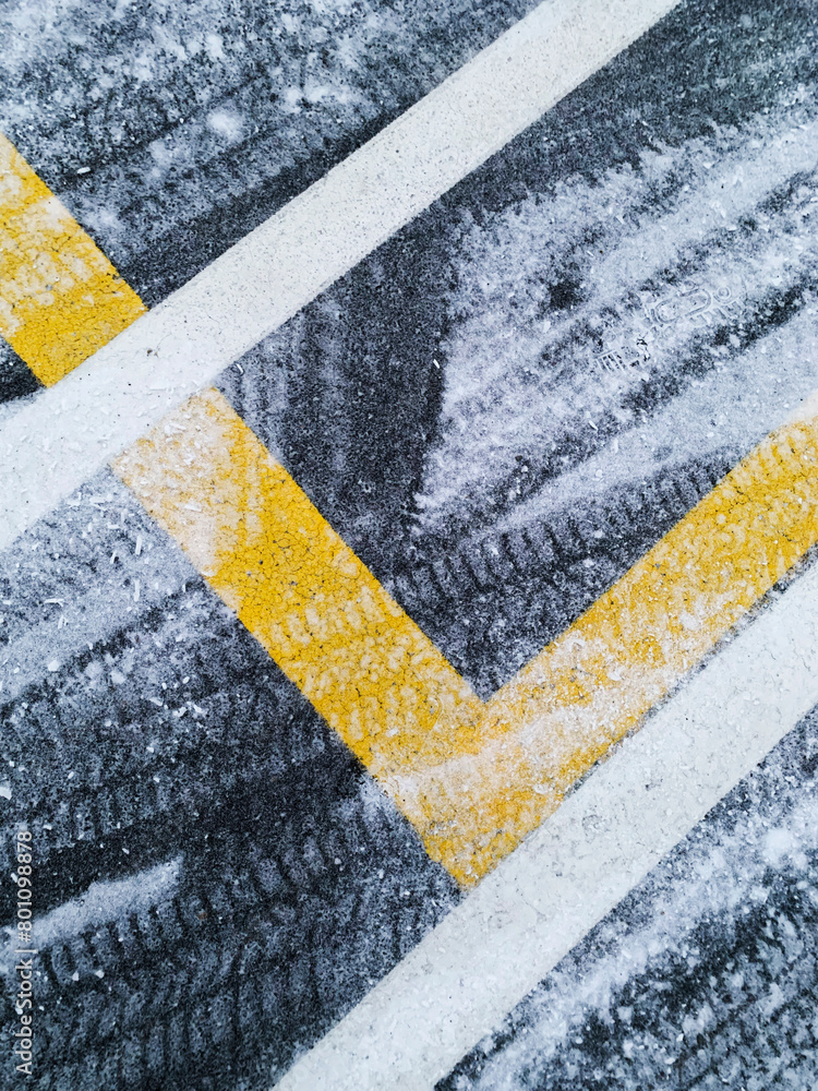 Snowflakes on grey street with yellow land white lines, street with space for text, no person