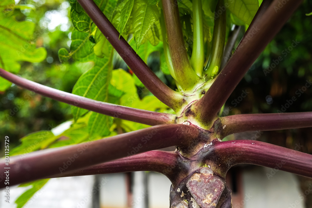 Close up photo of Unique purple papaya tree (Carica papaya var. purpurea) with purple color of trunk and petiole. Concept for agriculture, urban farming.