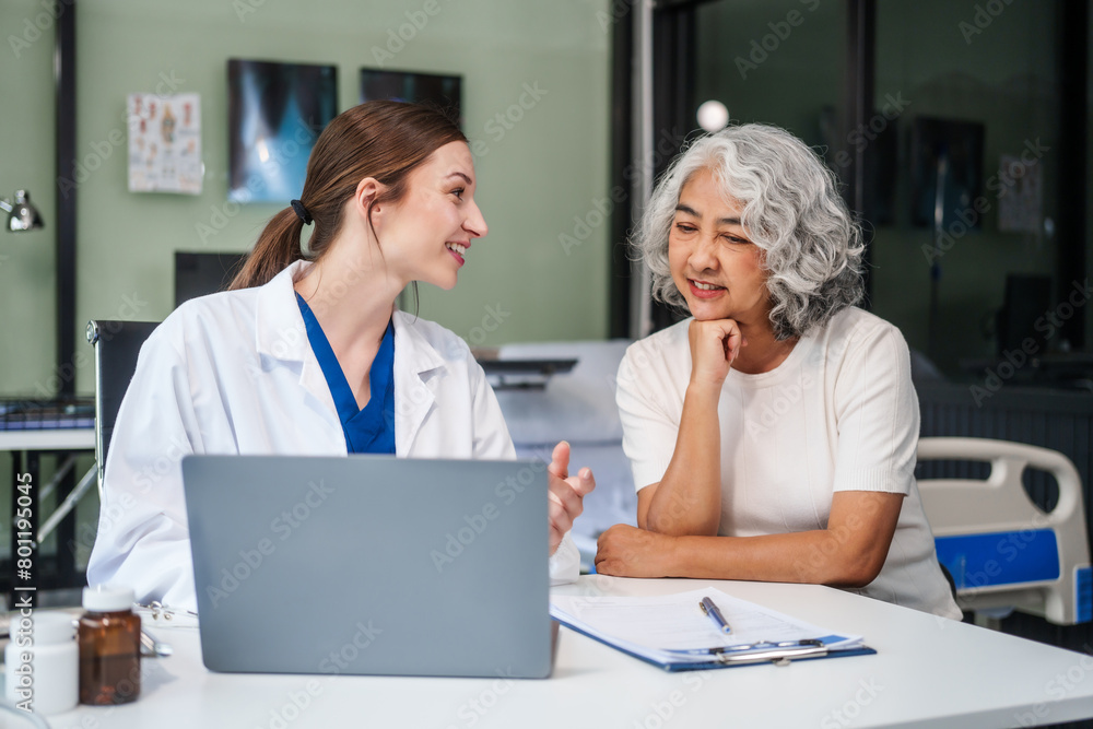 Monthly health check-ups and counseling sessions are provided to an elderly Asian woman by a Caucasian female caregiver, offering support, advice, and motivation.