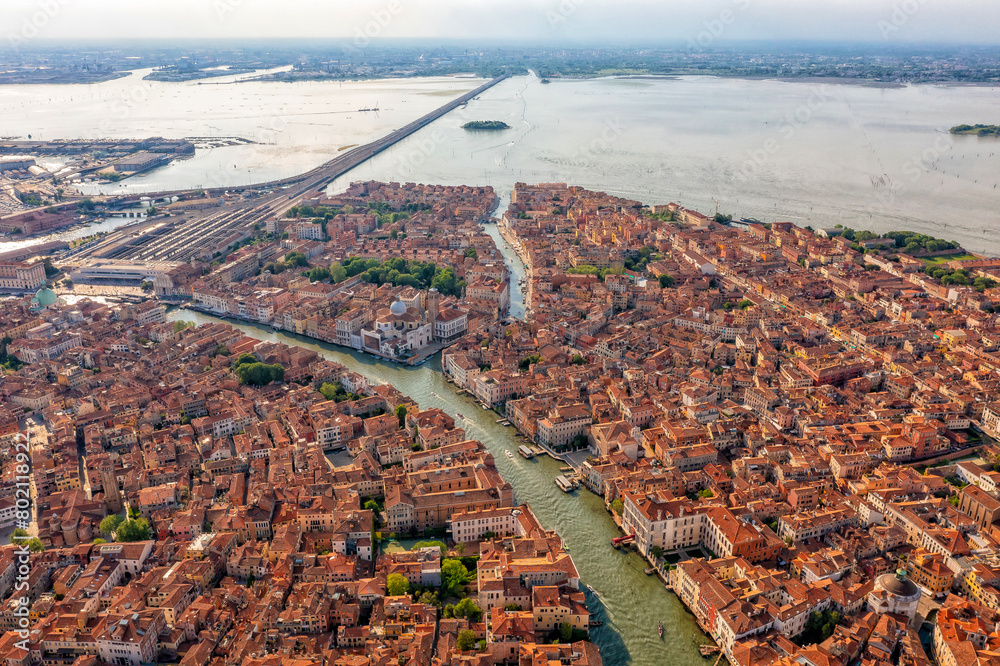 Amazing city view from above on building roofs and canals. Aerial view of Venice, San Polo, Italy.