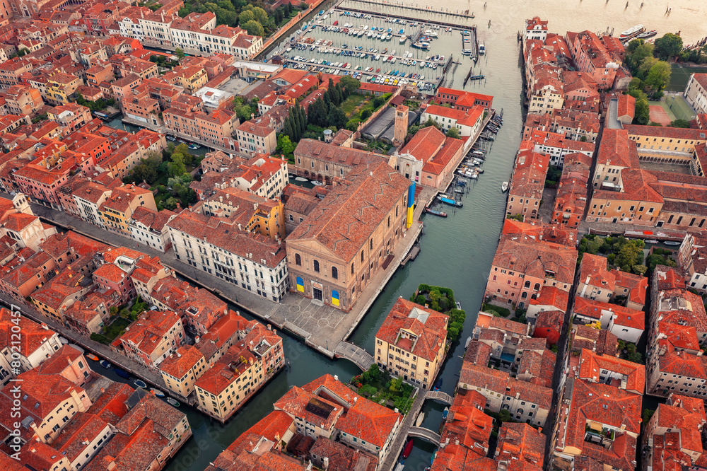 Panoramic shot Venice, Cannareggio, Italy. Tiled roofs and streets. Historical buildings. Tourism.