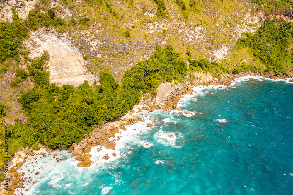 Clean calm blue sea with white foam near shore. Drone view high cliff. Bali, Klungkung, Indonesia