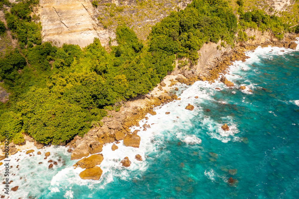 Turquoise sea water in sun. White foam waves breaks against the rocks. Vacation and travel concept.