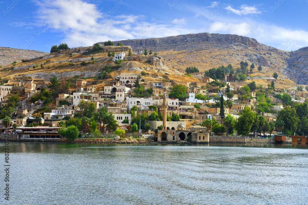 Partly submerged mosque of Eski Halfeti due to the construction of the Birecik dam on the Euphrates River, Old Halfeti, Turkey