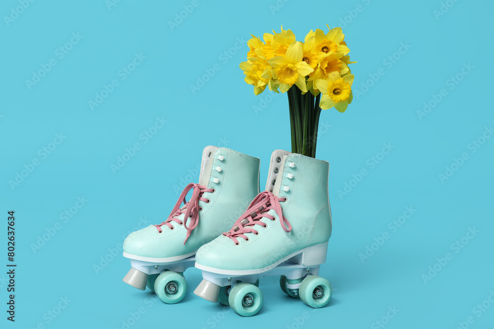 Vintage roller skates with bouquet of beautiful narcissus flowers on blue background