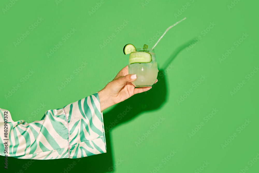 Female hand holding glass with refreshing sweet and sour cocktail with lien and cucumber taste against green background. Concept of alcohol and non-alcohol drink, party, holidays. Copy space for ad