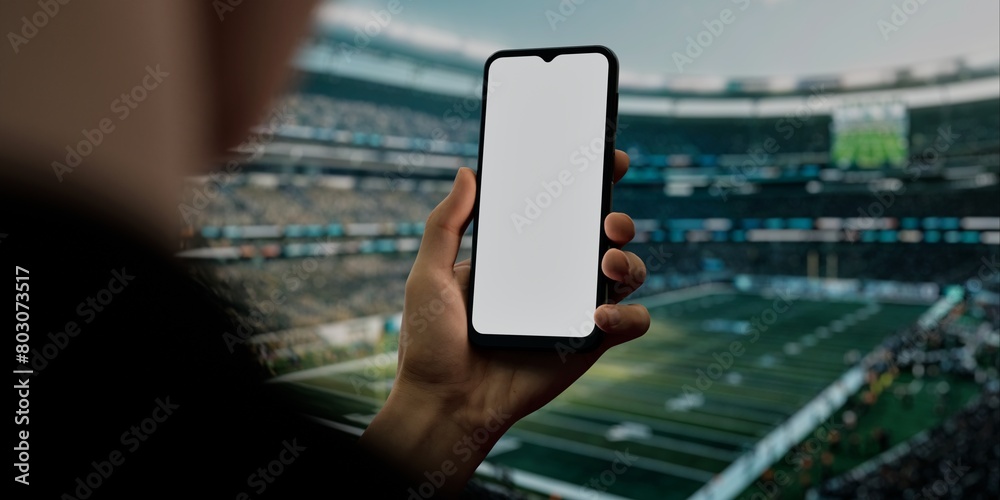 Hand with smartphone at football stadium, perfect for betting, live-stream apps