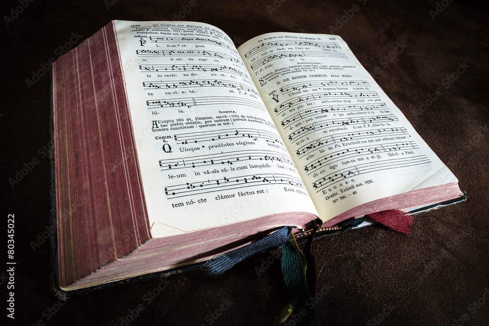 Vintage psalm book with chorus singing notes