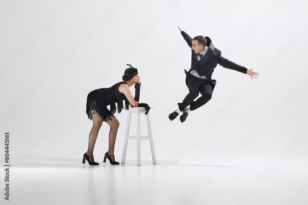 Young elegant woman in stylish black dress leaning on chair and watching man energetically dancing isolated over white studio background. Concept of art, retro and vintage, hobby, entertainment, 20s