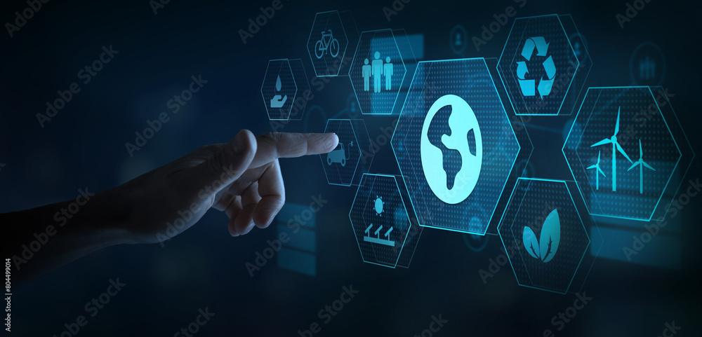 Sustainable development and green business, ecology and environment protection concept on touchscreen