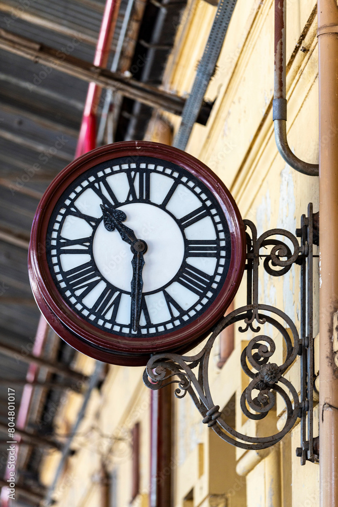 Antique clock with Roman numerals at the deactivated train station in Campinas, state of Sao Paulo, Brazil