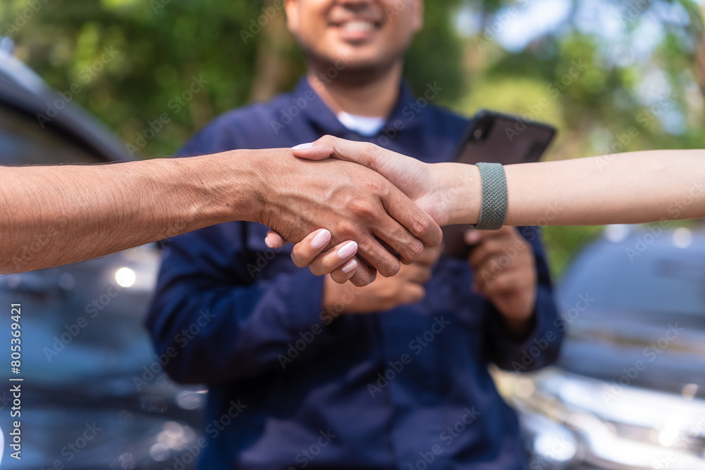 Happy asian insurance agent smiling to camera with two drivers can agree and shaking hands together after traffic accident. Parked on side way Call Emergency assistance or insurance claim service.