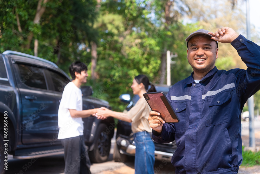Happy asian insurance agent smiling to camera with two drivers can agree and shaking hands together after traffic accident. Parked on side way Call Emergency assistance or insurance claim service.
