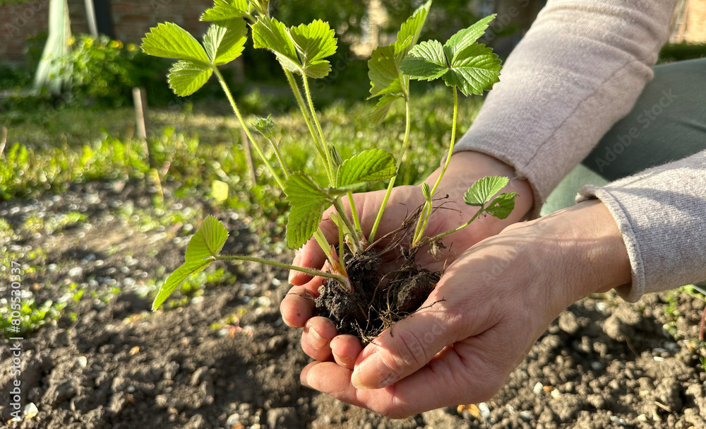Woman holding a small plant of strawberry with soil in hands