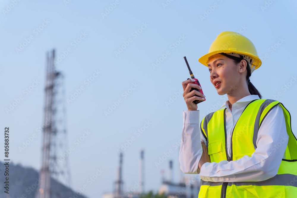 Happy beautiful Asian woman petrochemical engineer using walkie talkie with petroleum oil refinery in industrial estate background. Worker woman engineer at power plant energy industry manufacturing.