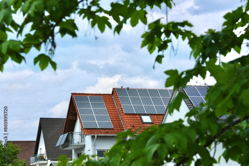 Solaranlage auf Einfamilienhaus umgeben von Blättern symbolisiert die grüne, nachhaltige Stromerzeugung und Energiewende mit Solarstrom zur Nutzung der Sonnenenergie