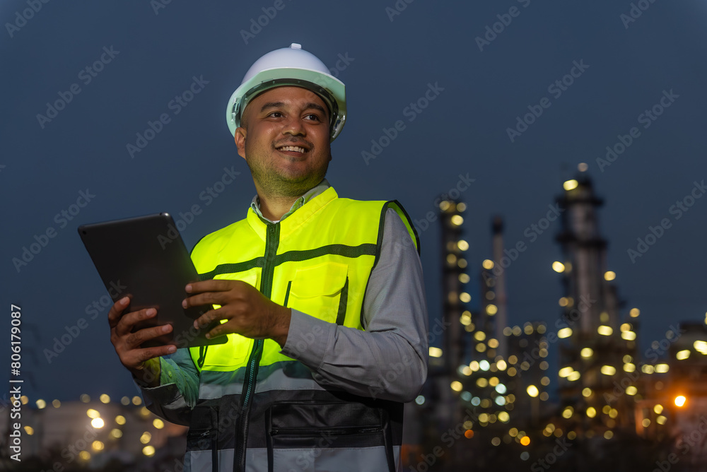 Night scene. Happy handsome Asian man petrochemical engineer working with digital tablet. He going through routine checks at petroleum oil refinery in industrial estate.