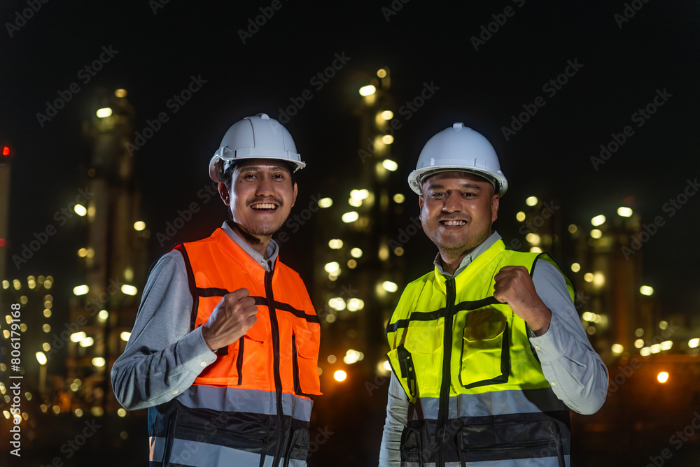 Happy handsome Asian man petrochemical engineers using digital tablet working and shaking hands together after going through routine checks at petroleum oil refinery in industrial estate.