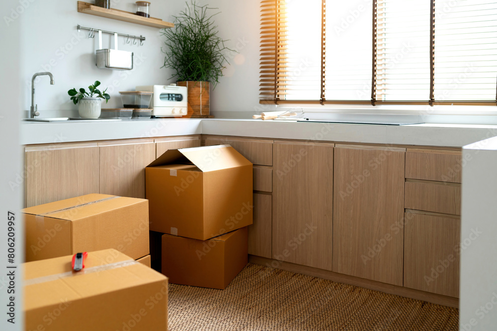 cardboard box storing new kitchen place. open and close packaging in kitchen room concept of relocating or changing home. decoration in room include kitchenware counter and box for moving in places