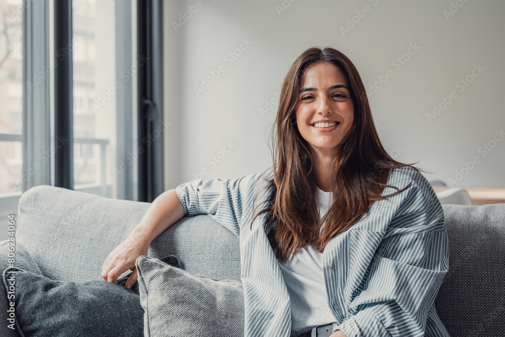 Happy attractive young adult woman girl sitting on sofa looking at camera in modern cozy home, smiling single 20s lady beautiful face relaxing on couch alone enjoy wellbeing posing for portrait.