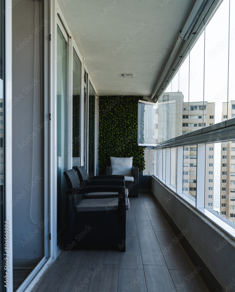 balcony with two wooden chairs, and a white chair at the background, looking outside. The balcony is closed by glass panels.