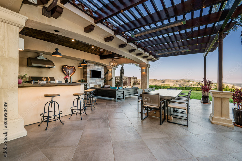 an outdoor kitchen with a large bar and two tables on the porch