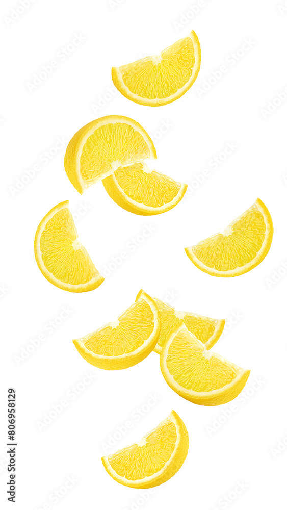 Falling lemon slice, isolated on white background full depth of field