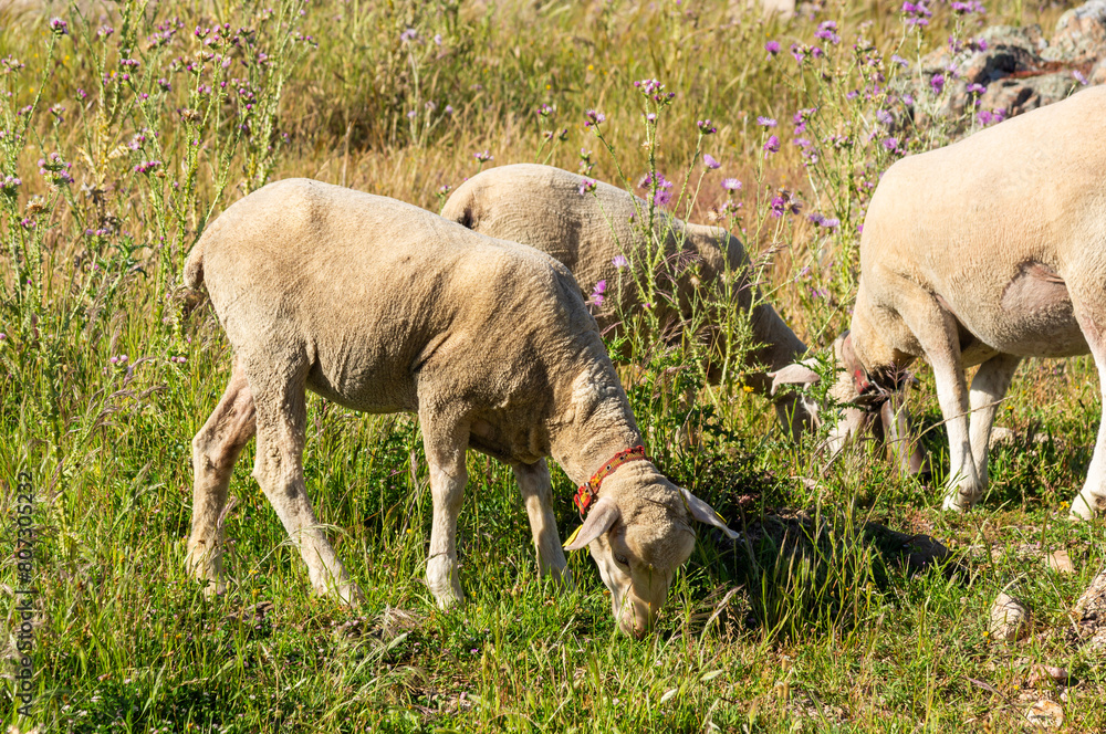 Spring Grazing: Freshly Sheared Merino Sheep in the Flourishing Meadow.