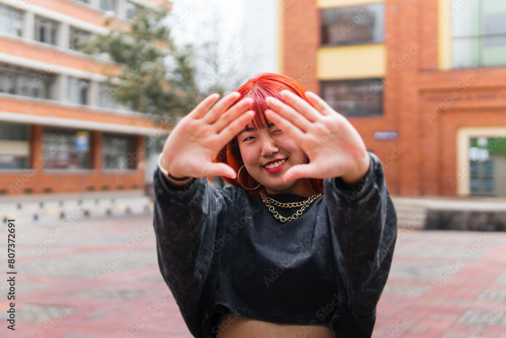 Cheerful Korean woman playfully framing her face with hands in urban setting