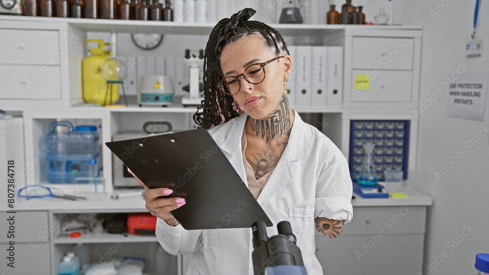 Amputee hispanic woman scientist meticulously reading crucial document, relishing doubt, while introspecting in high-tech lab