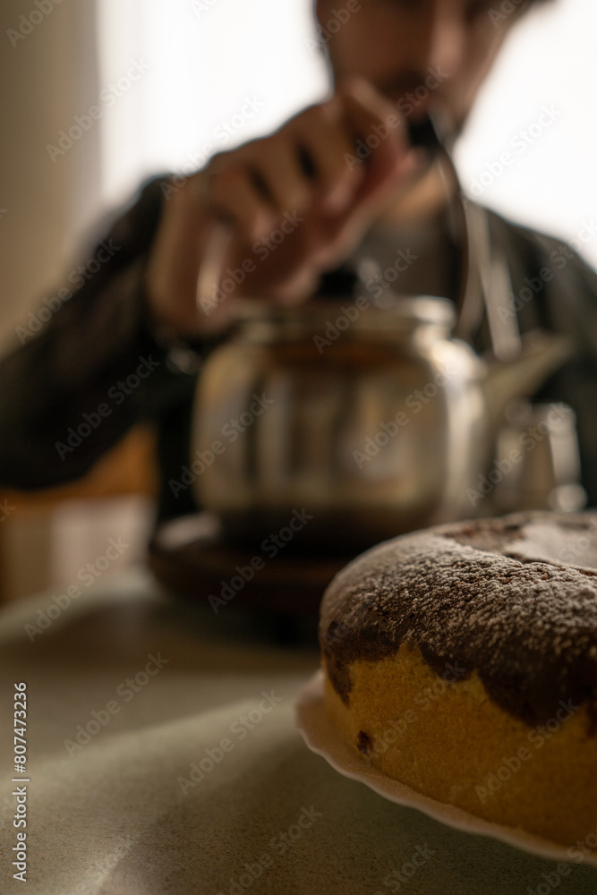 chocolate cake and in the background a person drinking mate (Argentine tradition)