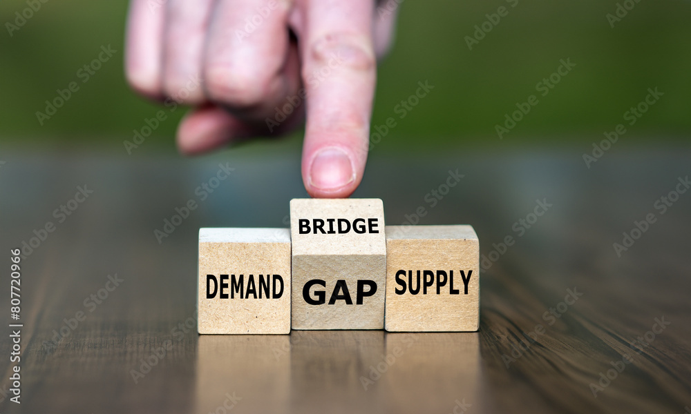 Hand turns cube and changes the word 'gap' to 'bridge' between the two words demand and supply. Symbol for closing the gap between a demand and the supply.