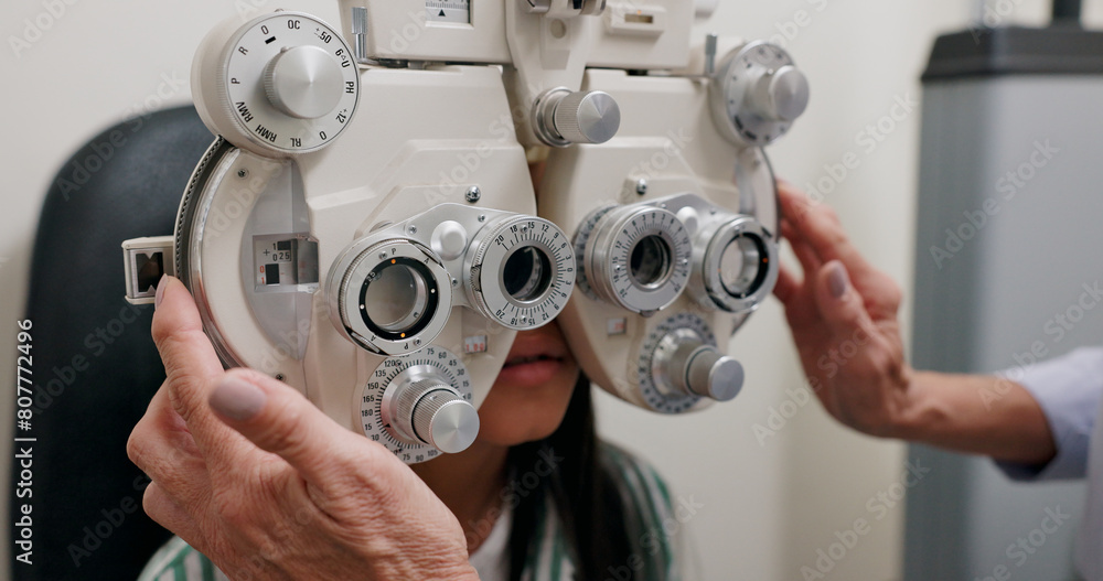 Child, machine and eye exam for vision in clinic with ophthalmology, optical assessment and healthcare service. Check for eyes, phoropter and girl patient with myopia and medical test for insurance