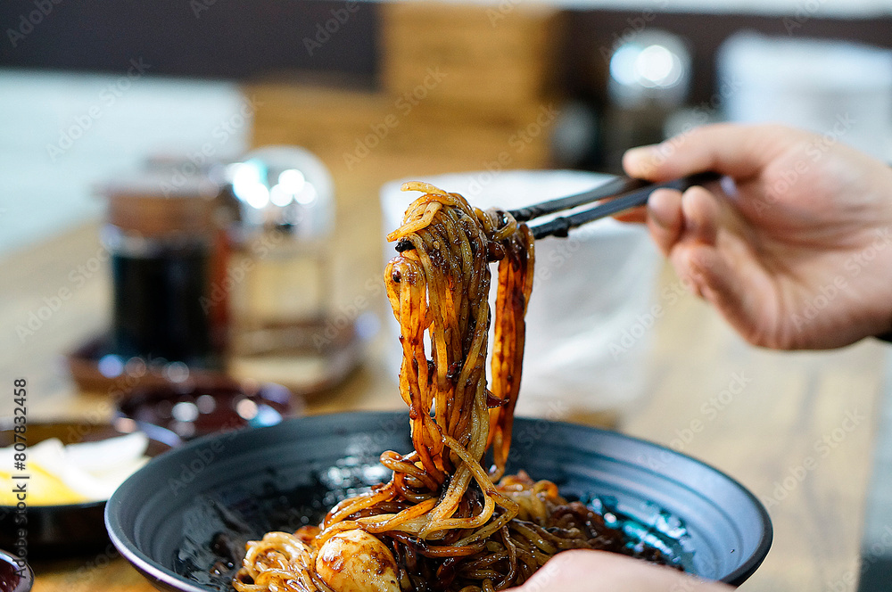 중화요리 식당에서 짜장면을 맜있게 먹는 모습