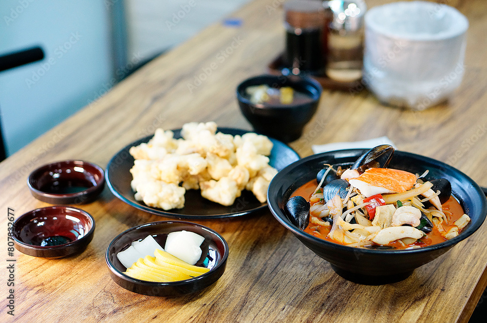 중화요리 식당에서 홍합짬뽕과 탕수육을 주문 후 테이블 위에 놓여 있는 모습