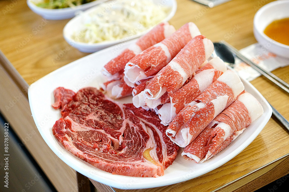 식탁 위에 삼겹살이 놓여있는 모습
