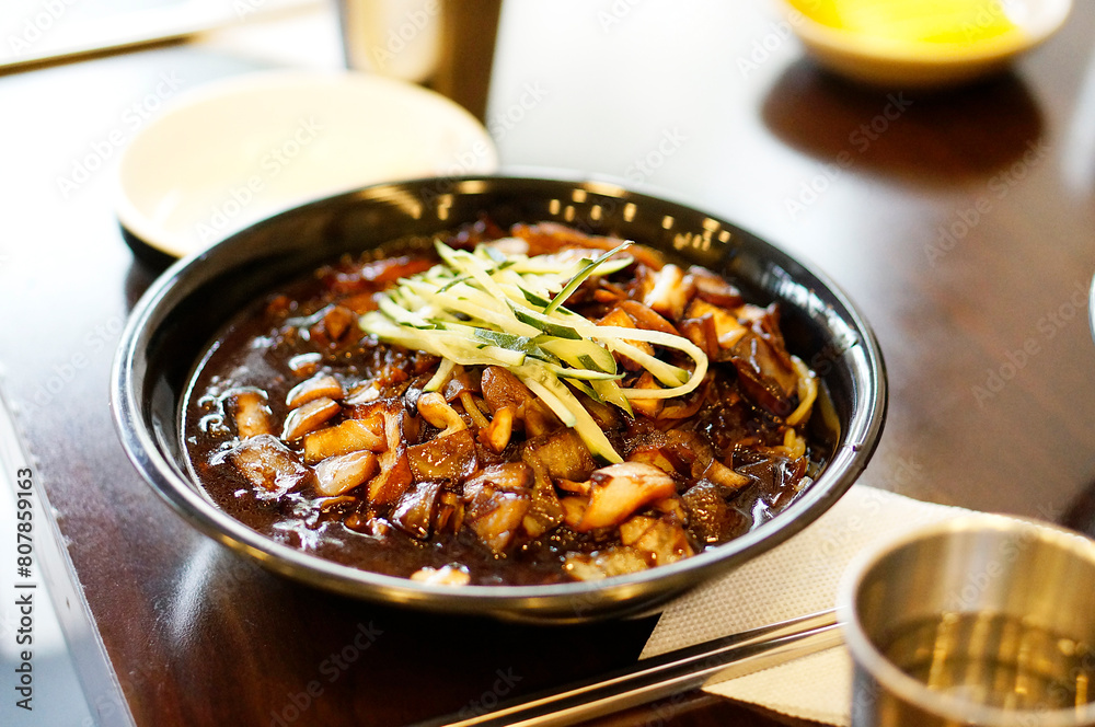 식탁 위의 짜장면을 확대한 사진,