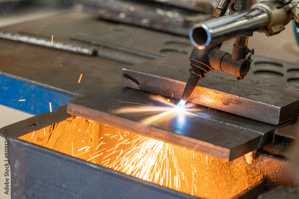 A close-up of a plasma cutting machine slicing through a thick metal plate, with bright sparks and intense heat demonstrating the power of industrial machinery