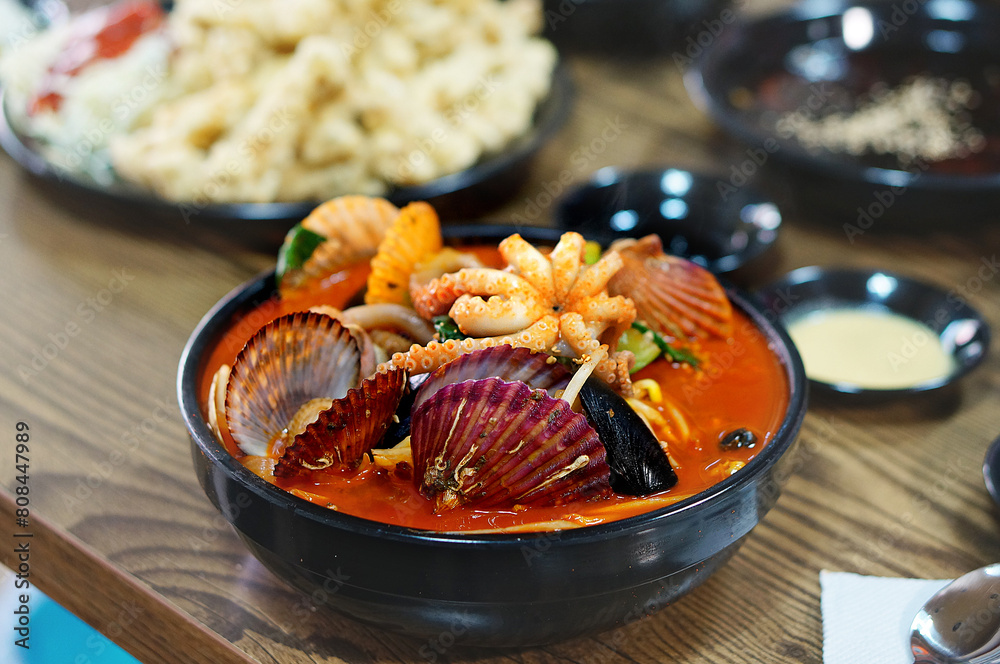 식탁 위에 얼큰한 조개 짬뽕을 확대한 모습