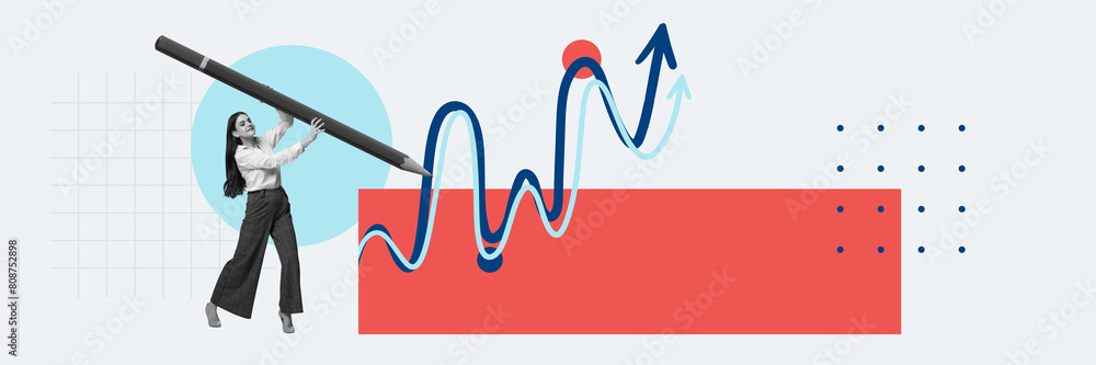 Banner. Contemporary art collage. Woman with huge pencil drawing chart which directed upwards against background with copy space. Concept of business, steps for successful growth, best practice.